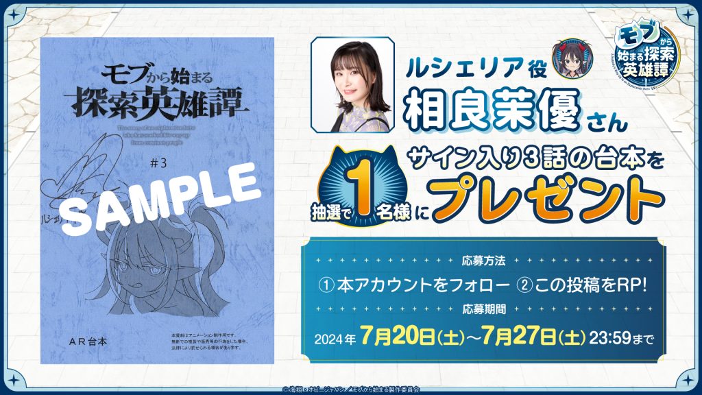 TVアニメ『モブから始まる探索英雄譚』公式Xアカウントでは、本日7月20日(土)からルシェリア役 相良茉優さんサイン入り台本のプレゼントのフォロー&RPキャンペーンを実施いたします。