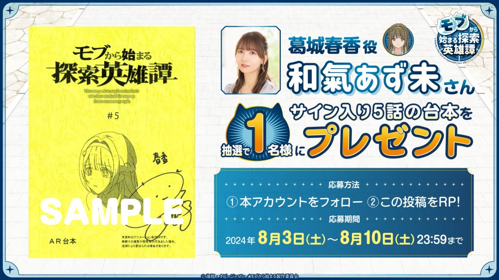 TVアニメ『モブから始まる探索英雄譚』公式Xアカウントでは、本日8月3日(土)から葛城春香役 和氣あず未さんサイン入り台本のプレゼントのフォロー&RPキャンペーンを実施いたします。