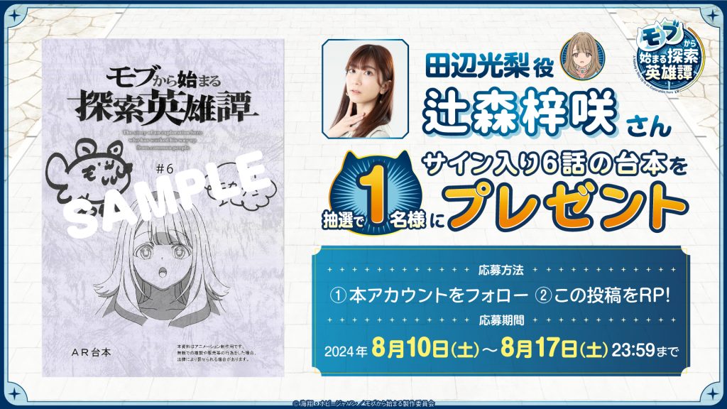 TVアニメ『モブから始まる探索英雄譚』公式Xアカウントでは、本日8月10日(土)から田辺光梨役 辻森梓咲さんサイン入り台本のプレゼントのフォロー&RPキャンペーンを実施いたします。