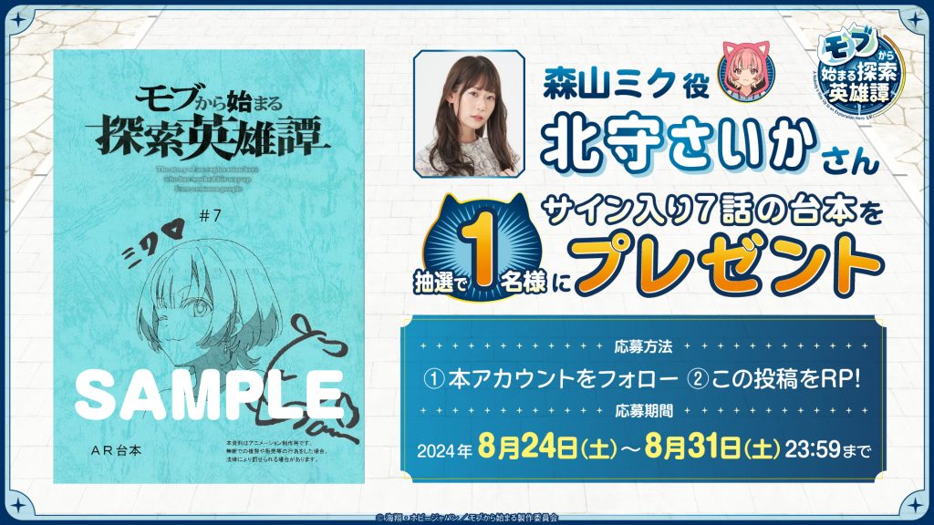 TVアニメ『モブから始まる探索英雄譚』公式Xアカウントでは、本日8月17日(土)から森山ミク役 北守さいかさんサイン入り台本のプレゼントのフォロー&RPキャンペーンを実施いたします。