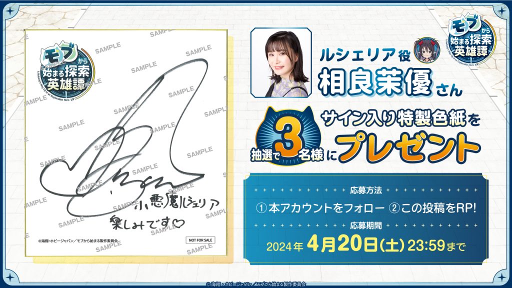 TVアニメ『モブから始まる探索英雄譚』公式Xアカウントでは、本日4月7日(日)からルシェリア役 相良茉優さんサイン入り特別色紙のプレゼントのフォロー&RPキャンペーンを実施いたします。